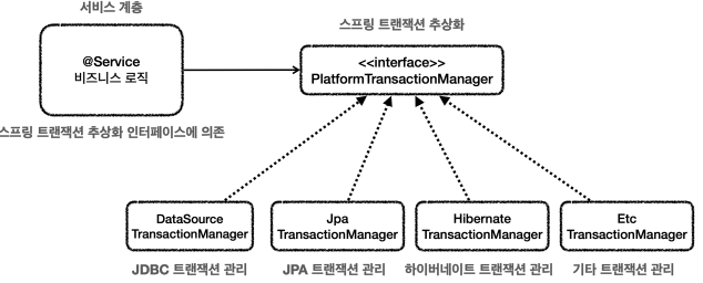 - 트랜잭션을 시작하려면 먼저 데이터베이스 커넥션이 필요하므로 트랜잭션 매니저는 내부에서 DataSource를 사용해 서 커넥션을 생성합니다.