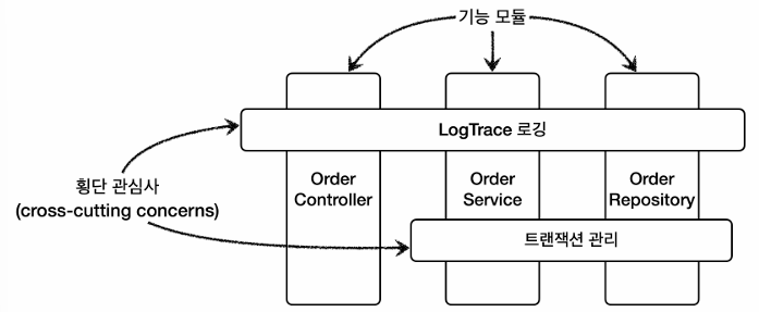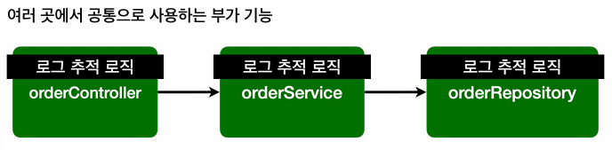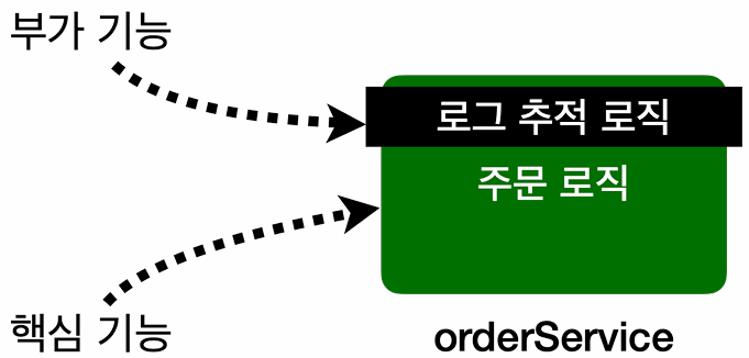 하지만, 이런 핵심 기능 이외에 로그를 남기기 위한 로직이나 트랜잭션 기능 등 핵심 기능을 보조하는 기능들도 필요합니다. 이런 기능을 부가 기능이라고 하는데 보통 부가 기능은 여러 클래스에 걸쳐서 함께 사용됩니다. 즉, 하나의 부가 기능이 여러 곳에서 동일하게 사용됩니다.