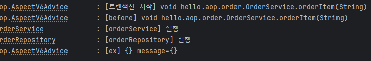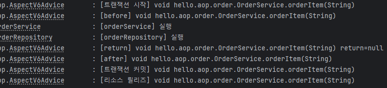 스프링 AOP 구현하기 - 1에서 사용한 코드(OrderService, OrderRepository, AopTest)를 이용하여 테스트하면 아래와 같이 결과가 나오는 것을 확인할 수 있습니다.