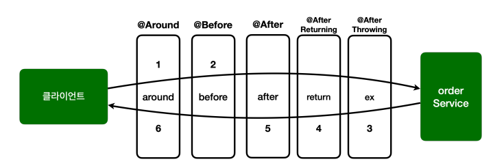 @Aspect 안에서 위 Advice들이 존재할 때, 위와 같은 순서로 실행됩니다. 단, 호출 순서와 리턴 순서는 반대입니다.