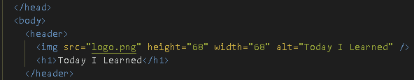 아래에서 <img>와 <h1>을 <header> 라는 시맨틱 태그로 감싸고 있습니다. 이는단지 <img>와 <h1>을 grouping 하는 역할로, <header>가 없어도 구조에는 영향이 없습니다. 하지만, <header>로 감쌈으로써 추후에 CSS를 사용하여 동일한 styling 적용이 가능합니다.