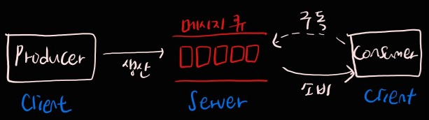 - Producer와 Consumer는 Client의 역할을, 메시지 큐는 Server 역할을 한다고 생각할 수 있습니다. 클라이언트와 서버는 네트워크를 통해 통신합니다.