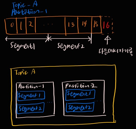 새로운 메시지는 partition 꼬리 부분에 추가되며, offset은 점진적으로 증가하게 됩니다. 그리고 각 파티션은 일정한 크기의 로그 세그먼트로 나누어져 디스크에 저장됩니다. 이는 파티션의 데이터를 관리하기 쉽게 하며, 오래된 로그 세그먼트는 자동으로 삭제하거나 압축하여 디스크 사용 효율을 높일 수 있습니다.