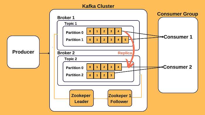 - 리더와 팔로워: 각 파티션은 복제를 위해 리더와 팔로워로 나뉩니다. 리더 파티션은 데이터를 쓰고 읽는 주 역할을 담당하며, 팔로워 파티션은 리더의 데이터를 복제하여 저장합니다.