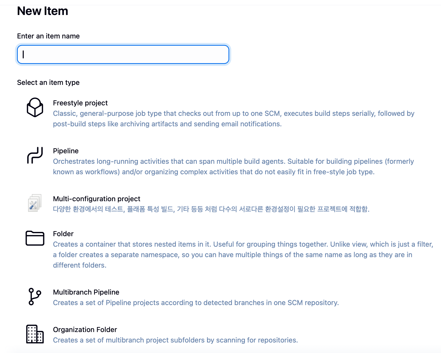 그러면 아래와 같은 화면이 나오는데, item name 은 원하는 문자열을 넣고, 저희는 Pipeline을 선택합니다.