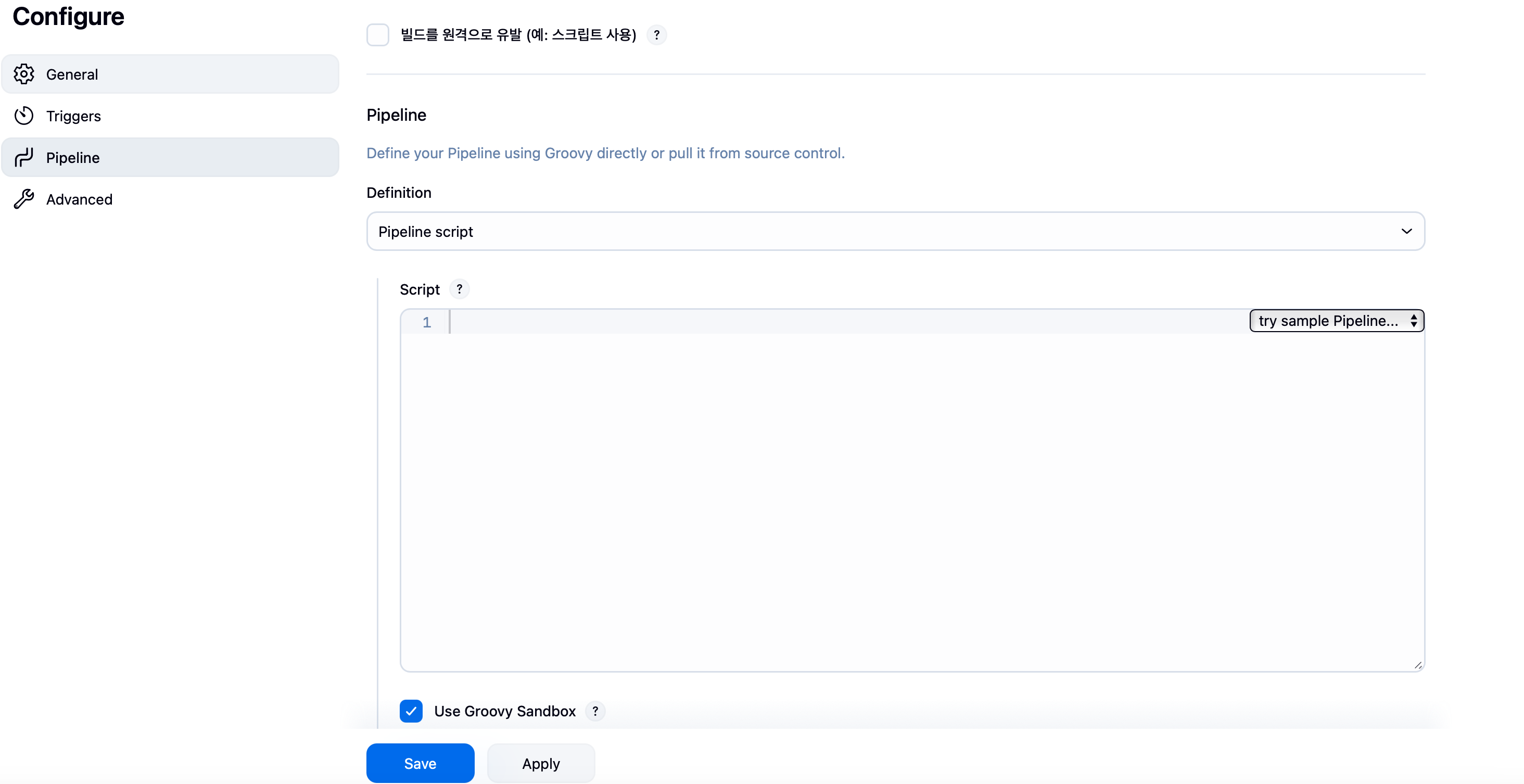그리고 아래로 쭉 내려와 Script에 아래 Jenkinsfile을 작성 후, 빌드를 트리거 하면 됩니다.