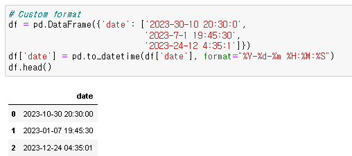 string형으로 되어 있는 데이터를 datetime 형으로 바꿀 때, string 형 데이터의 날짜 순서가 뒤죽박죽 섞여 있거나 다른 형식으로 되어 있을 때, format 인자에 적절하게 값을 매핑해 주어야 합니다.