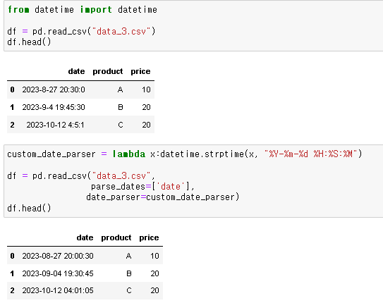 아래와 같이, pd.read_csv 함수의 parse_dates 인수에 열 이름을 리스트 형식으로 넣으면 자동으로 datetime 형식으로 변환해 줍니다. 이를 활용해 read_csv 함수에서 여러 개의 컬럼을 datetime으로 변환해 보겠습니다.