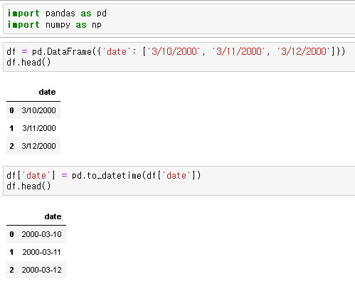 먼저, string으로 되어 있는 데이터 타입을 datetime 데이터 타입으로 여러 가지 방법으로 변환해 보겠습니다.