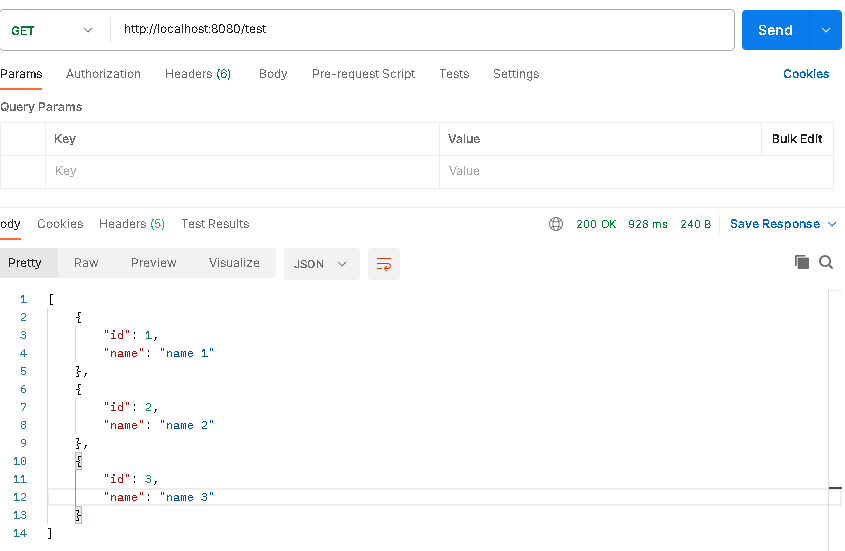 위 코드를 이용하여 Postman으로 http:localhost:8080/test 요청을 보내면 아래와 같이 data.sql에서 저장한 데이터를 얻을 수 있습니다.