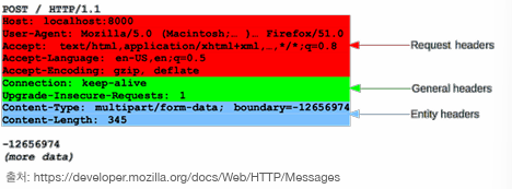- Request 헤더: 요청 정보, 예) User-Agent: Mozilla/5.0 (Macintosh;..)