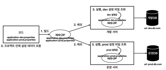 application.properties 파일을 각 서버마다 만들어서 애플리케이션 로딩 시점에 해당 파일을 읽어 설정값을 사용할 수도 있습니다. 하지만, 설정을 변경해야 할 때마다 각 서버에 들어가서 각각의 설정값들을 수정하고 관리해야 하는 것은 매우 번거롭습니다. 이를 해결하기 위해서는 각 용도에 맞는 설정 파일들을 프로젝트 내부에 포함하고, 각 파일들을 각각의 용도에 사용할 수 있도록 내부에서 분리함으로써, 빌드 시점에 각 환경마다 설정 파일을 모두 포함하여 쉽게 배포할 수 있습니다.
