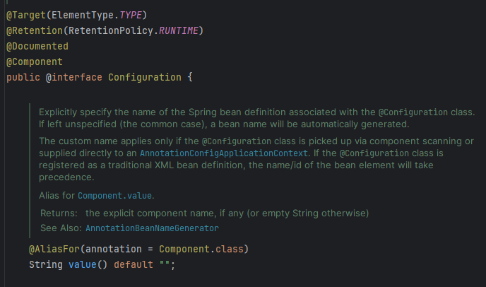 참고로, @Configuration 내부를 살펴보면 아래와 같이 @Component 애너테이션이 붙어 있기 때문에 @Configuration이 붙은 설정 정보도 컴포넌트 스캔의 대상이 되어 자동으로 스프링 빈으로 등록됩니다.