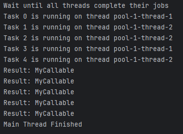 아래 코드를 실행하면 ExecutorService가 관리하는 쓰레드들의 작업들이 main 쓰레드가 종료되고 비동기적으로 수행됨을 확인할 수 있습니다.