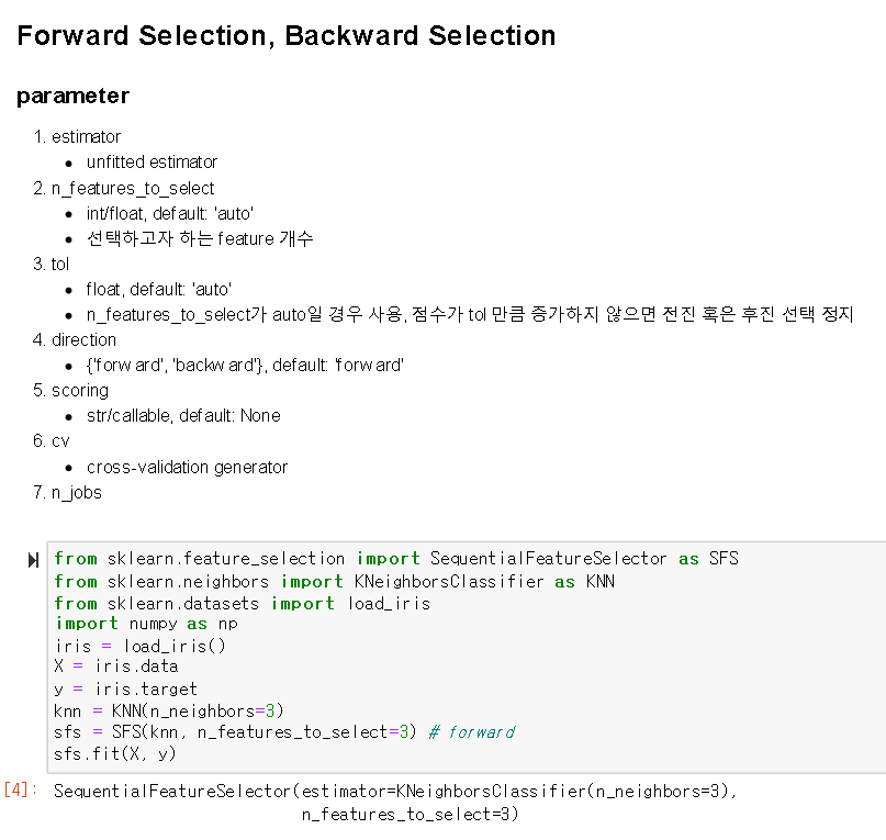 1) Forward Selection: 변수가 없는 상태로 시작하여 반복할 때마다 가장 중요한 변수를 추가하여 더 이상 성능의 향상이 없을 때까지 변수 추가