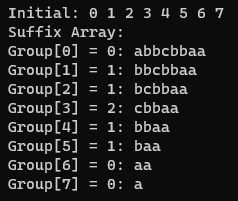 아래는 Suffix Array를 정렬해 가는 과정을 단계별로 출력해 보았습니다.