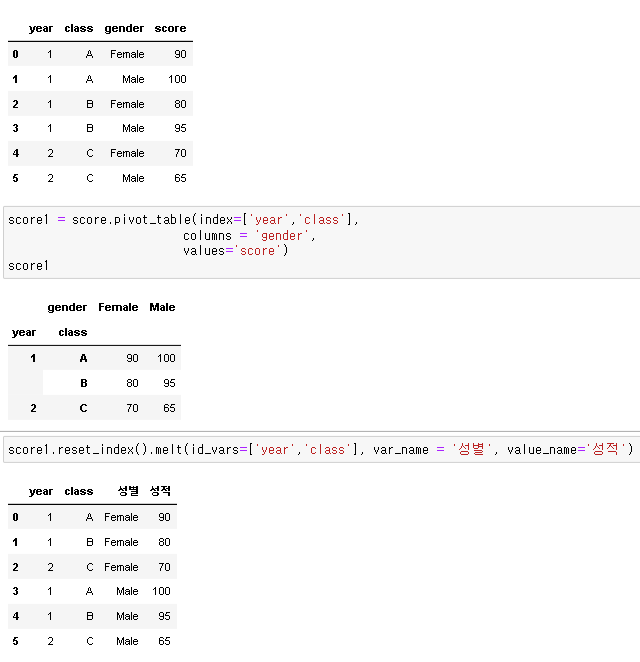 첫 번째 테이블은 원본 테이블이고, 2번째 테이블은 위에서 pivot_table을 적용한 결과입니다. 마지막 테이블은 melt 함수를 이용하여 원본 테이블과 비슷한 결과로 되돌려 놓은 결과입니다.