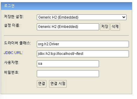 - URL: 예) jdbc:h2:tcp://localhost/~/test