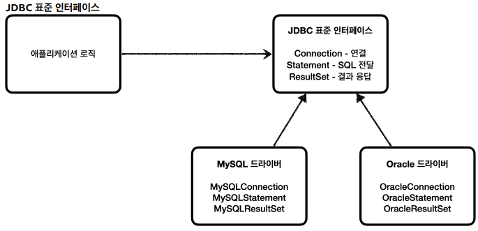 - 데이터베이스를 다른 종류의 데이터베이스로 변경하면 애플리케이션 서버의 데이터베이스 사용 코드도 함께 변경해야 하는 문제 ▶ 애플리케이션 로직은 JDBC 표준 인터페이스에만 의존하기 때문에 데이터베이스를 다른 종류의 데이터베이스로 변경하고 싶으면 각 벤더에 맞는 JDBC 구현 라이브러리(JDBC 드라이버)만 변경하면 됩니다. 즉, 애플리케이션 서버의 사용 코드를 그대로 유지할 수 있습니다.