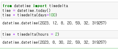 마지막으로 datetime 형식으로 되어 있는 데이터들끼리는 어떻게 연산을 할 수 있는지 알아보겠습니다. 이는 datetime 모듈의 timedelta()를 사용하여 datetime 객체에 더하거나 뺄셈을 수행할 수 있습니다.