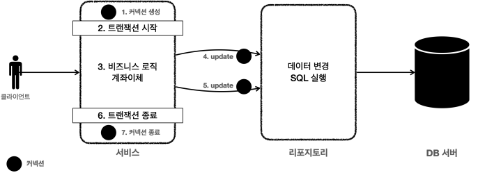 위 그림에서 알 수 있듯이, 트랜잭션은 비즈니스 로직이 있는 서비스 계층에서 시작해야 합니다. 비즈니스 로직에서 문제가 있어서 트랜잭션에 실패하면 롤백해야 하기 때문입니다.