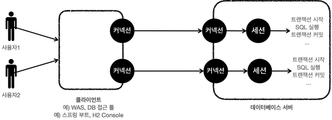 - 사용자는 웹 애플리케이션(WAS)나 DB접근 같은 클라이언트를 통해 데이터베이스 서버에 연결을 요청하고 커넥션을 맺게 됩니다.