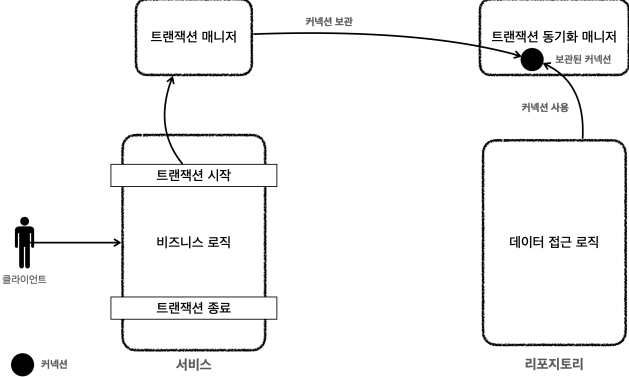 - 트랜잭션 매니저는 트랜잭션이 시작된 커넥션을 트랜잭션 동기화 매니저에 보관합니다.
