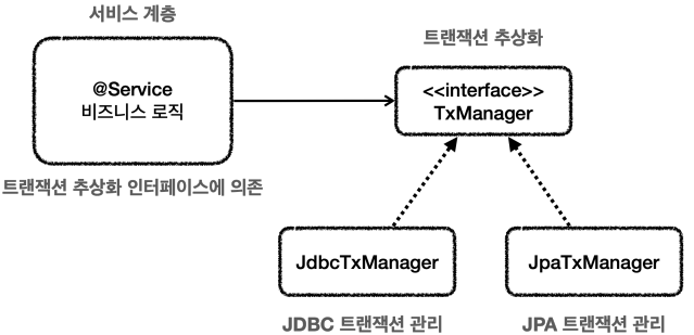따라서 트랜잭션 추상화를 통해 서비스 계층과 JDBC 기술과 같은 특정 트랜잭션 기술에 직접 의존하지 않도록 해야 합니다. 즉 아래와 같이 추상화된 인터페이스에 의존하도록 수정이 필요합니다.
