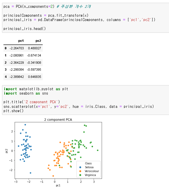 위와 같이 종속 변수를 잘 설명(분류)하는 산포도를 확인할 수 있습니다. 기존 데이터프레임은 차원이 4였다면, PCA를 통해 차원을 2로 줄여 이차원 평면에서도 시각적으로 나타낼 수 있어 편리한 것 같네요!