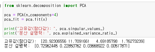 - explained_variance_ratio_: 전체 데이터에서 각 주성분이 설명할 수 있는 분산의 비율