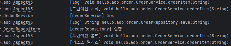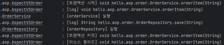 아래 결과를 보면, TxAspect이 먼저 적용되고 LogAspect이 적용되었음을 확인할 수 있습니다.