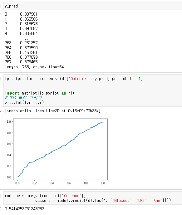 아래 그림은 실제로 데이터를 이용해서 roc curve, auc score을 측정한 결과입니다. 주의할 점은, roc_curve 함수를 사용할 때 y_pred 인자에 예측 확률을 넣어주어야 한다는 점입니다.