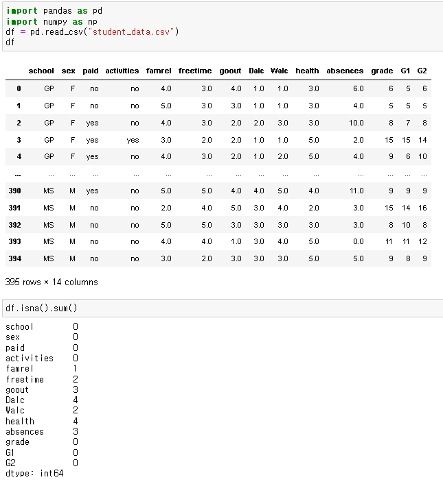 그림과 같이 결측치가 존재하고, 결측치가 존재하는 데이터는 수치형 데이터인 것을 확인할 수 있습니다.