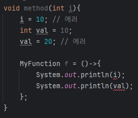또한, 람다식의 매개변수는 외부 지역변수와 같은 이름을 가질 수 없습니다.