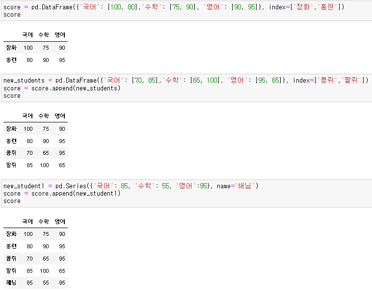 데이터프레임에 한 행을 추가하는 것은 append()를 사용합니다. append의 인수로는 DataFrame, Series, Dictionary 가 들어갑니다.