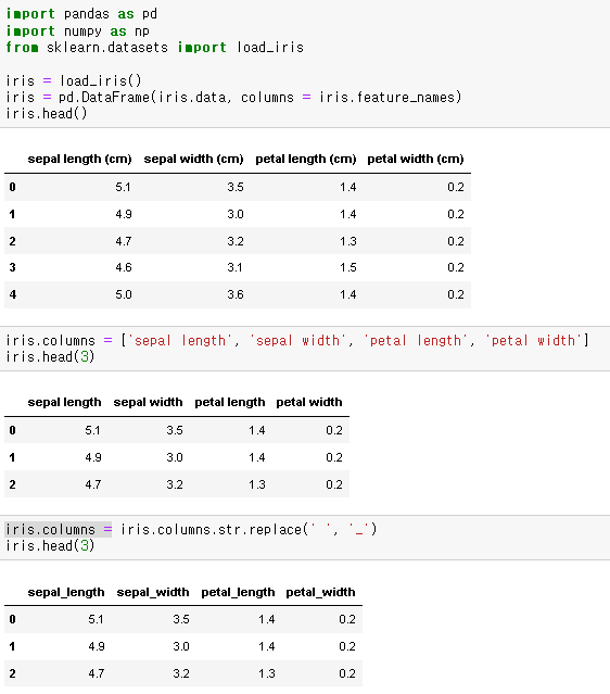 column 명을 변경하려면 index와 동일한 방법은 df.columns에 배열을 넣어주면 됩니다. 혹은 아래와 같은 방법을 사용합니다. (sklearn 라이브러리에서 제공하는 iris 데이터를 사용했습니다.)