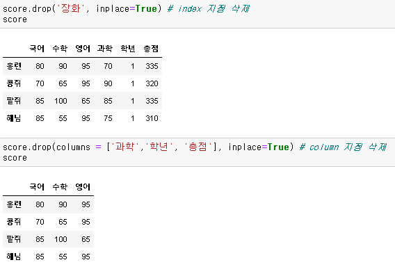 행이나 열을 삭제하고 싶다면 drop()을 사용하여 삭제할 수 있습니다. 하지만 행과 열을 동시에 삭제할 수는 없습니다.