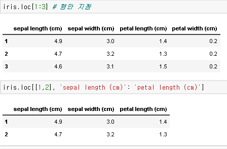 밑에서 알 수 있듯이 iris.loc[1:3]은 위에서 보았던 iris.iloc[1:4]와 같다는 것을 알 수 있습니다.