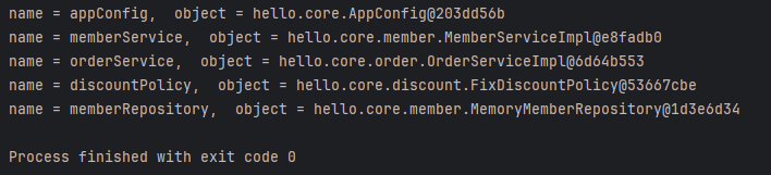 위에서 컨테이너에 등록된 빈을 모두 조회해보도록 하겠습니다. (자바 설정 클래스나 XML 설정 파일 둘 다 같은 빈을 정의하고 있기 때문에 어떤 설정 정보를 사용해도 무관합니다.)