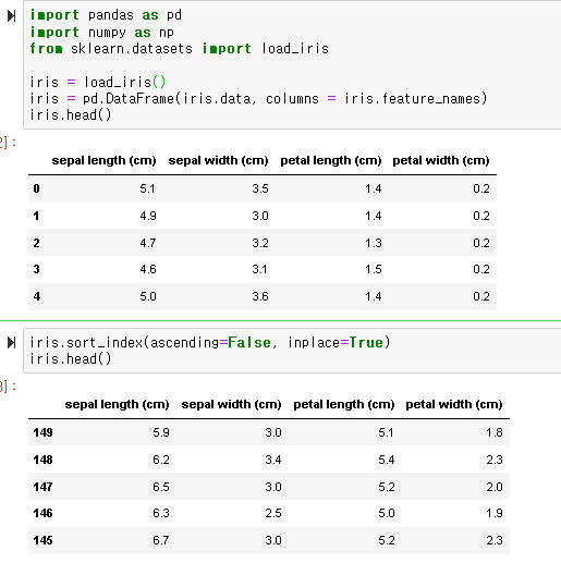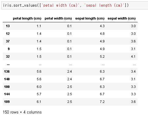 아래 코드에서 확인해 보겠습니다. sklearn 라이브러리의 iris 데이터를 로드하여 데이터프레임으로 만든 후, 행을 기준으로 정렬한 결과입니다. ascending 속성을 False로 지정함으로써, 인덱스가 내림차순 정렬된 것을 볼 수 있습니다.