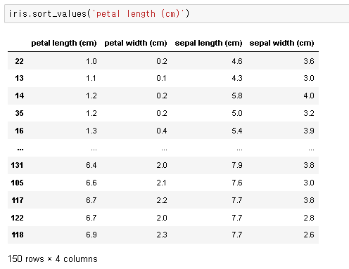 먼저 아래와 같이 하나의 컬럼을 이용하여 정렬해 보겠습니다. petal length 컬럼을 기준으로 오름차순 정렬이 되었음을 확인할 수 있습니다.