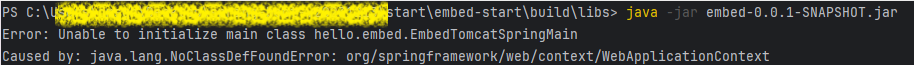 중요한 것은, JAR를 푼 결과에 스프링 라이브러리나 내장 톰캣 라이브러리가 전혀 포함되어 있지 않습니다. 그래서 오류가 발생했던 것입니다. 이는, Jar 파일이 Jar 파일을 포함할 수 없기 때문입니다.