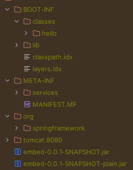 해당 문제를 확인하기 위해 jar 파일의 압축을 풀어 ($ jar -xvf embed-0.0.1-SNAPSHOT.jar) 내용물을 확인해 보면 아래와 같은 구조를 가지는 것을 확인할 수 있습니다. (참고로, MySpringBootMain 클래스 파일은 이 프로젝트에는 사용되지 않습니다.)