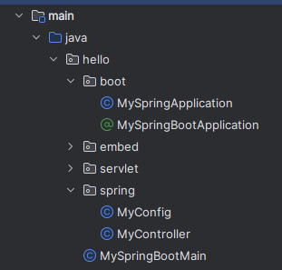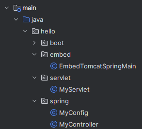 이번에는 아래 패키지 구조를 가지는 클래스들을 사용할 것이고, embed 폴더 내EmbedTomcatSpringMain.class 는 모두 주석처리 해야 합니다. (해당 포스팅 혹은 전체 소스 코드 통해 아래 클래스들 코드를 참고할 수 있습니다.)