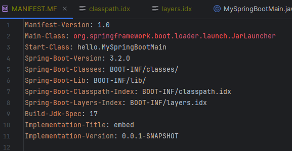 java -jar xxx.jar를 실행하면서 META-INF/MANIFEST.MF 파일을 찾고, 여기에 명시된 Main-Class를 읽어서 main()를 실행하게 됩니다. MANIFEST.MF 내부를 보면 아래와 같습니다.
