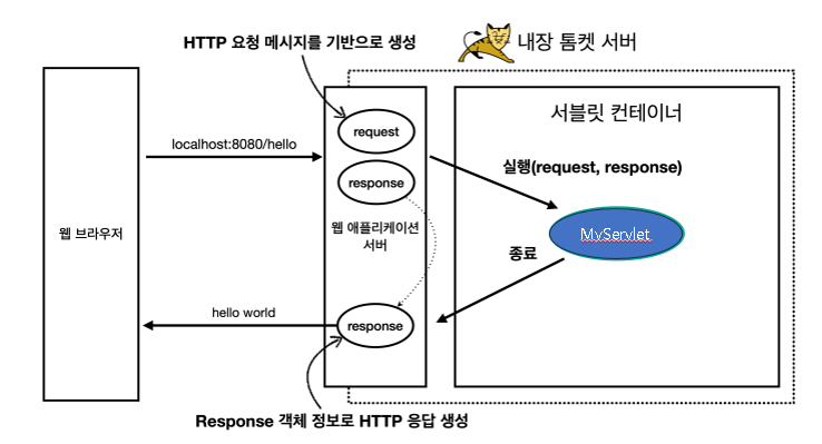 - 이때, 쓰레드가 Servlet 객체 호출하고 request,response 객체를 Servlet 객체에 넘겨줌.