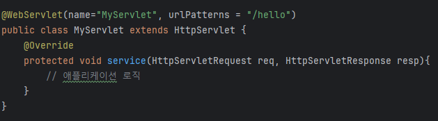 - urlPatterns(/hello)의 URL이 호출되면 서블릿 코드가 실행됩니다.