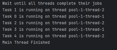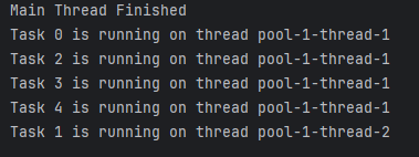 아래 코드를 실행하면 ExecutorService가 관리하는 쓰레드들의 작업들이 main 쓰레드가 종료되고 비동기적으로 수행됨을 확인할 수 있습니다.