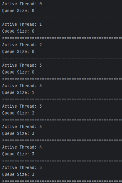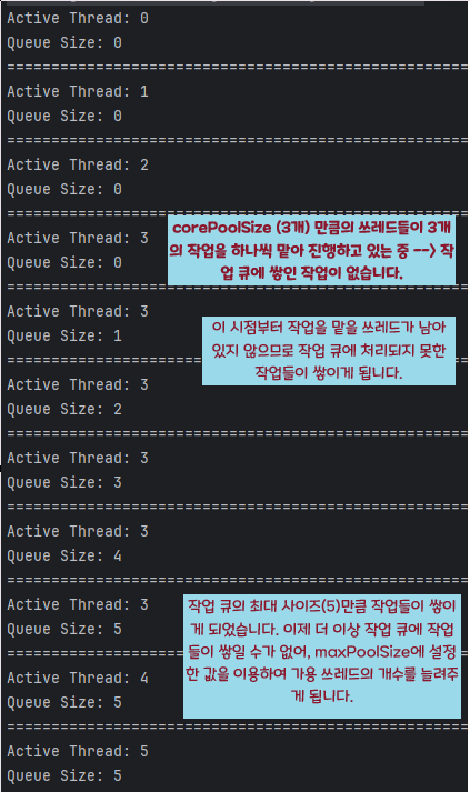 위와 같이 작성하여 각 단계에서 생성된 쓰레드 개수와 작업 큐에 대기 중인 작업 개수를 출력해 보았습니다. 아래 결과에 단계별로 어떻게 쓰레드가 생성되고 작업 큐에 작업들이 쌓이게 되는지 설명하였습니다.