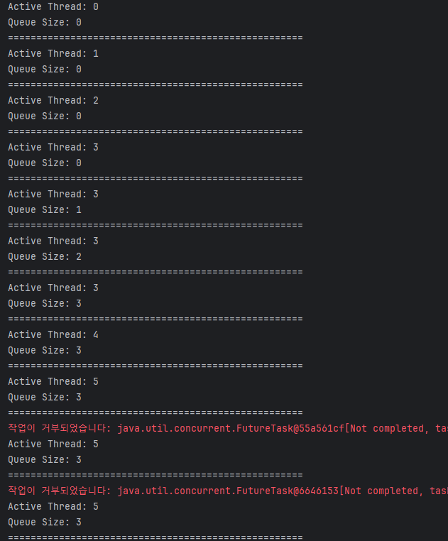 만약, 작업 큐에 빈 공간이 없고, maximumPoolSize 만큼 쓰레드들이 생성되었는데도 처리가 필요한 작업들이 계속 생성된다면 어떻게 될까요? 아래 코드를 통해 확인해 보겠습니다.